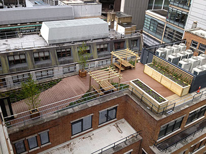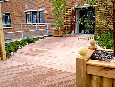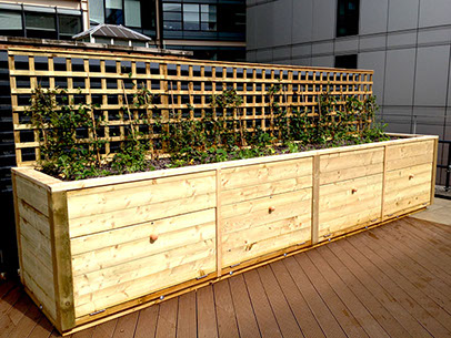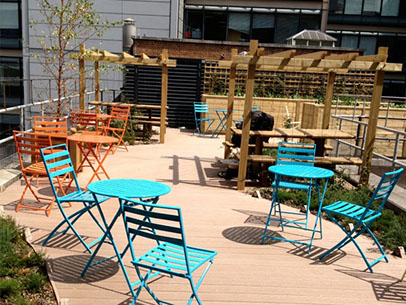 The task here was to transform a newly laid single ply roof into a usable recreation area for the office staff. We installed man made decking as well as a slabbed area for barbecues, planted beds for the pollinators, picnic tables and even bespoke planters for the staff to enjoy a spot of gardening.
