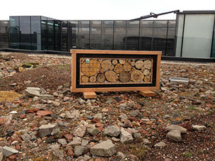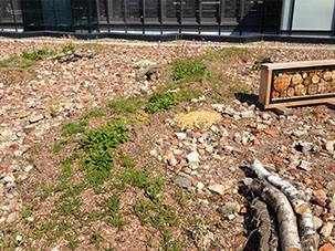 A Biodiverse installation is all about habitat creation. Typically called a Nature Roof, it can involve using varied depths of substrate essentially for spiders, a wide variety of planting for nectar loving insects and habitat incidentals including log piles to provide a home for beetles and other invertebrates.